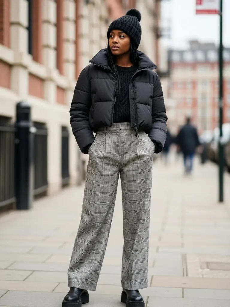 A cropped black puffer jacket is styled with wide leg grey plaid trousers and a black knit beanie. Chunky black boots add weight to the outfit and balance the cropped length. The mix of classic plaid and sporty outerwear feels fresh and current.