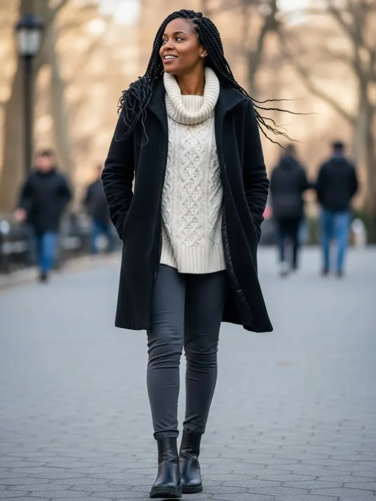 Black Coat With Cable Knit Sweater and Skinny Pants