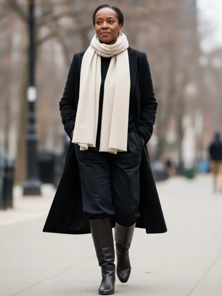 This look features a long black coat styled with an oversized light beige scarf and black knee high boots. Black trousers keep the outfit sleek while the scarf adds softness and contrast. The overall vibe feels elegant and winter ready.