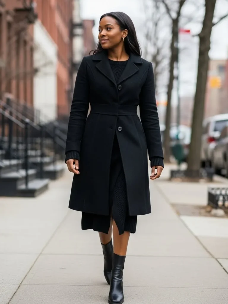 This look features a tailored black coat worn over a black knit midi dress. The clean lines of the coat define the waist nicely while the dress adds softness underneath. Sleek black ankle boots complete the outfit with a polished winter finish.
