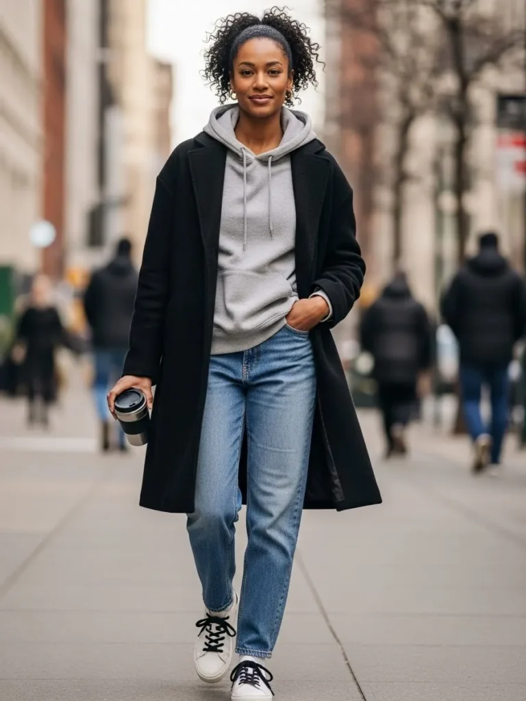 A relaxed black coat is layered over a soft grey hoodie and straight leg blue jeans. White sneakers keep the look casual and fresh while a takeaway coffee adds that everyday city feel. The mix of tailored and relaxed pieces makes the outfit feel modern and easy.