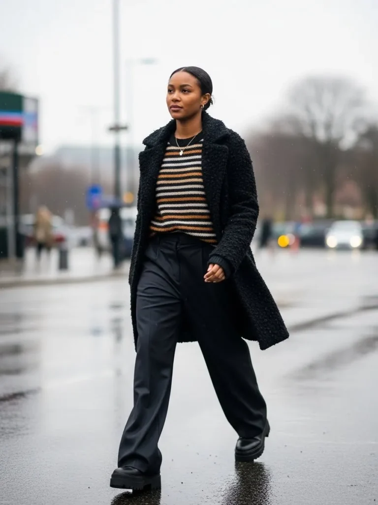 A textured black coat is styled with a striped knit sweater and wide leg black trousers. Chunky black shoes ground the outfit and give it a modern edge. The subtle stripes bring contrast while keeping the palette neutral.