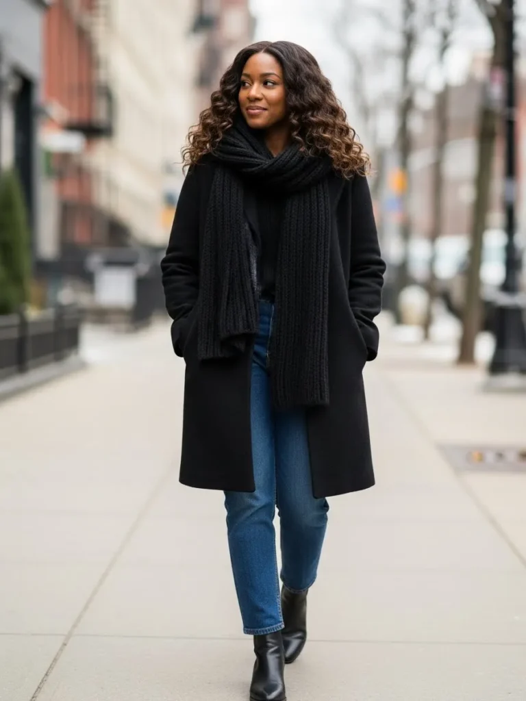 This outfit features a black coat paired with straight leg blue jeans and a chunky black scarf. Black ankle boots finish the look while keeping it practical for cold days. The scarf adds texture and warmth without overpowering the outfit.
