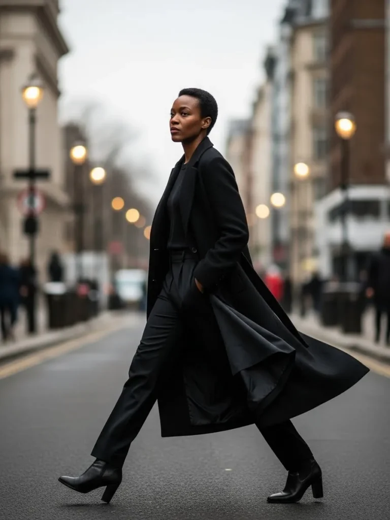 This look features a long black coat worn open over an all black outfit underneath. Slim black trousers and heeled ankle boots keep the silhouette sleek while the coat moves effortlessly with each step. The overall vibe feels bold and confident.