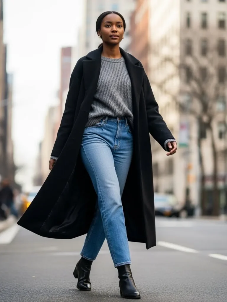 A black coat is styled with a textured grey knit sweater and classic blue straight leg jeans. Black ankle boots ground the look and keep it practical for city walking. The mix of cozy knit and structured coat feels perfectly balanced.