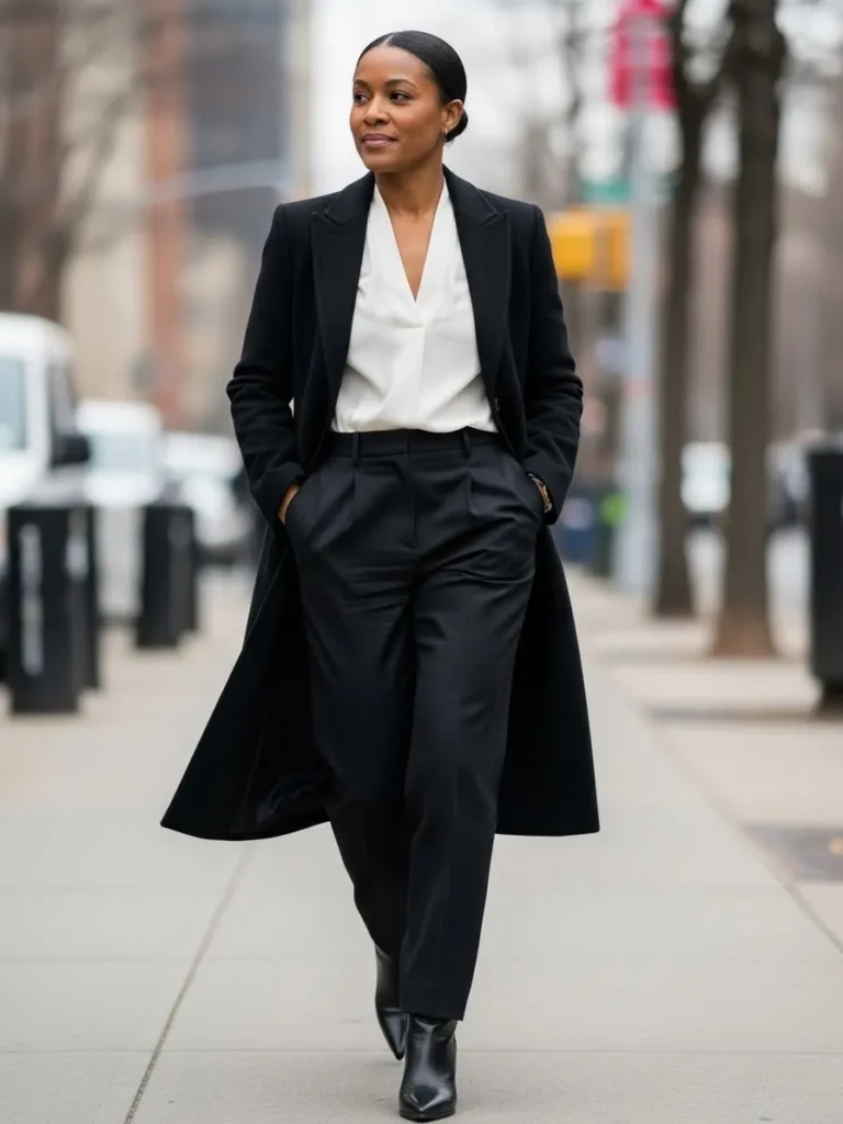 This look features a long black coat layered over a crisp white blouse and tailored black trousers. Sleek ankle boots keep everything sharp and minimal. The contrast between black and white gives the outfit a timeless city feel that never looks dated.