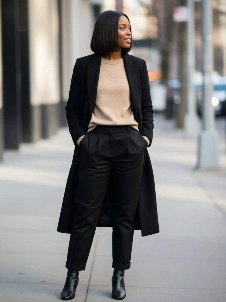 A black coat is layered over a beige knit sweater and tailored black pants. The neutral sweater softens the dark tones while ankle boots keep everything clean and modern. The overall look feels calm balanced and very wearable.