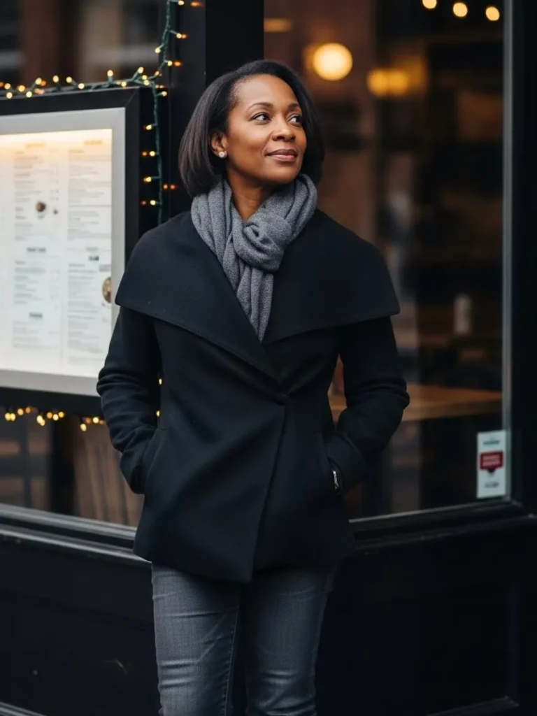 This outfit features a tailored black coat paired with classic grey jeans and a soft charcoal scarf wrapped neatly at the neck. The clean coat lines and muted tones create a refined everyday look that feels calm and confident. Simple stud earrings and hands tucked into the coat pockets give it an effortless city feel.