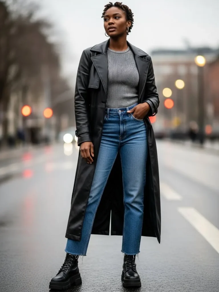 A long black leather style coat is layered over a fitted ribbed grey top and straight leg blue jeans. Chunky black lace up boots ground the look and give it a slightly edgy street style vibe. The mix of textures keeps the outfit interesting while still feeling wearable.