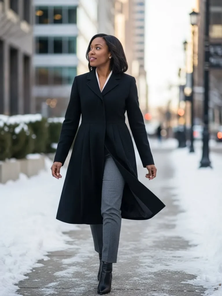 This outfit pairs a structured black coat with slim grey tailored pants and sleek black ankle boots. A light inner layer peeks through at the neckline adding contrast and polish. The coat moves beautifully while walking which gives the whole look a graceful winter flow.
