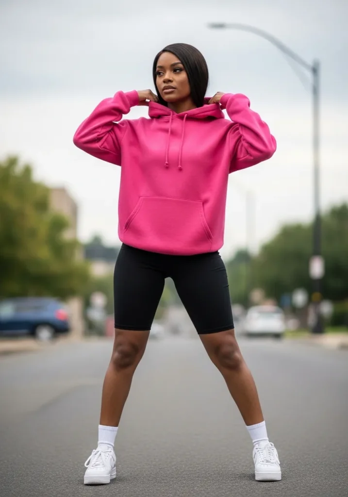 This outfit features an oversized hot pink hoodie paired with fitted black biker shorts and clean white sneakers. The relaxed hoodie brings that cozy streetwear feel, while the shorts keep the look sharp and confident. The bold pink shade makes the whole outfit feel energetic and unapologetic.