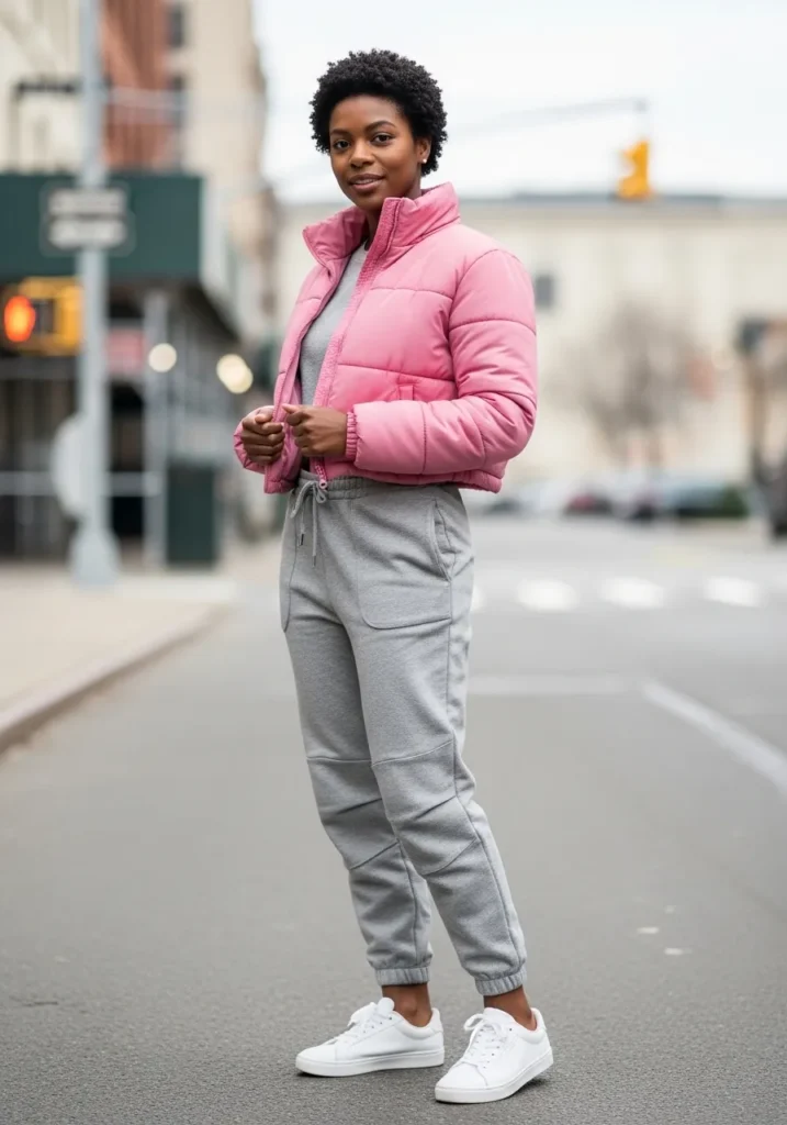 This outfit pairs a cropped pink puffer jacket with gray joggers and white sneakers for a sporty street style look. The pink jacket adds bold color and volume, while the neutral bottoms keep everything balanced. It feels modern, cozy, and confident.