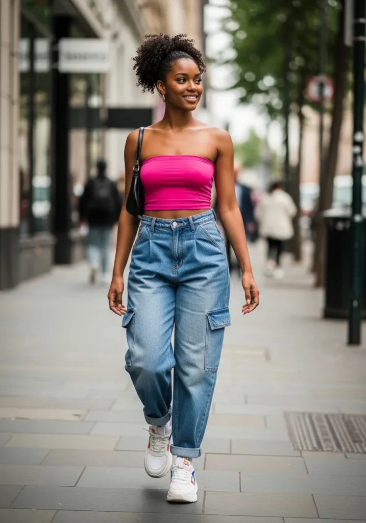 This look combines a bright pink tube top with relaxed fit blue jeans and white sneakers. The silhouette feels casual and cool, while the pink top keeps it bold and playful. It gives off effortless baddie vibes with minimal effort.