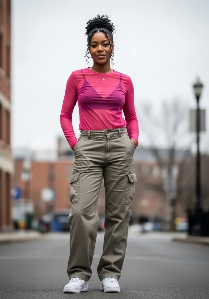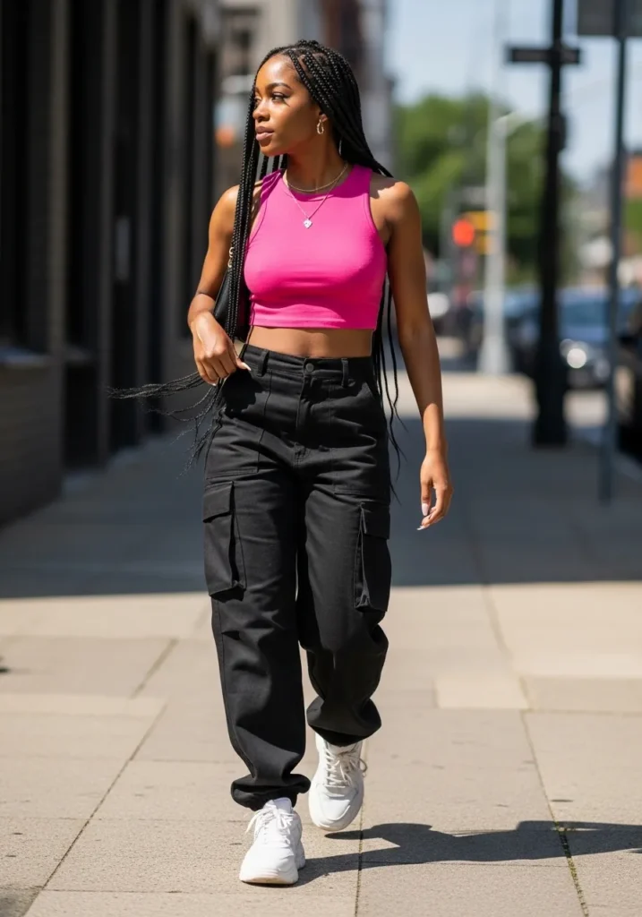 This look features a bright pink crop top paired with black cargo pants and sneakers for a strong street style moment. The fitted top contrasts beautifully with the relaxed pants, creating a bold and balanced silhouette. The pink instantly draws attention and gives the outfit its statement feel.