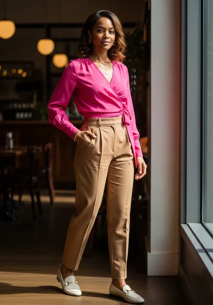 I love how this outfit proves pink can look strong and polished. The neutral pants let the blouse shine without stealing the moment. This is a look that makes me feel calm, confident, and very stylish.