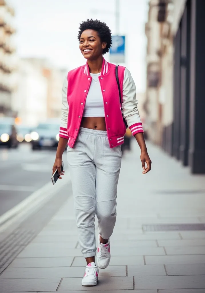 This look pairs a pink varsity jacket with a white top, light jeans, and sneakers for an easy street style vibe. The jacket adds that sporty edge, while the pink keeps the outfit fun and eye catching. It feels relaxed and youthful.
