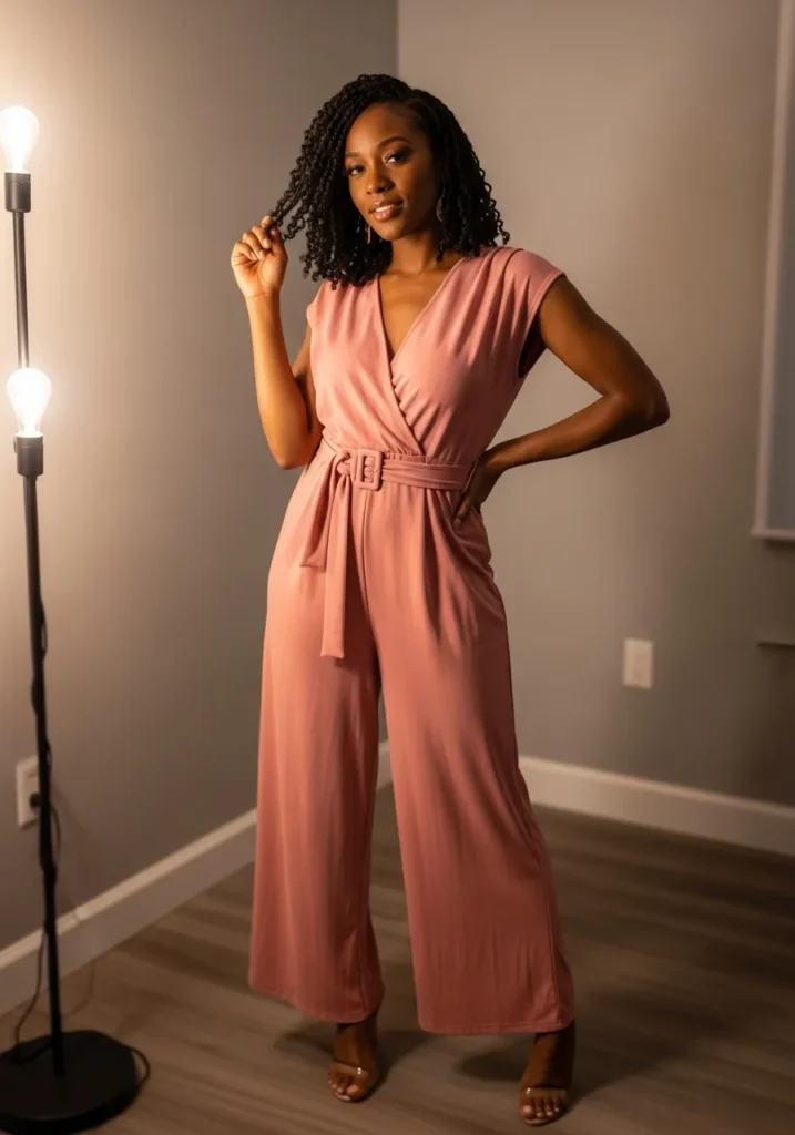 This outfit features a sleeveless soft pink jumpsuit with a cinched waist and wide legs. The silhouette feels elegant and relaxed at the same time, creating a flattering and confident look. The color keeps it light and romantic.