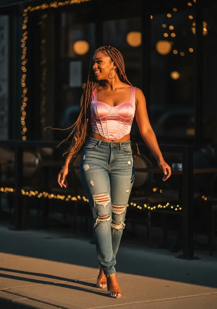 This look pairs a structured pink corset style top with light wash ripped jeans and heels for a confident city vibe. The fitted top highlights the waist, while the distressed denim adds edge and contrast. It feels flirty, bold, and perfectly baddie.