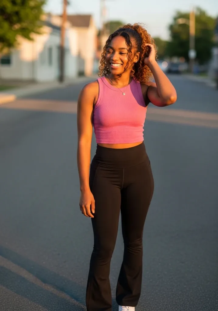 This outfit pairs a bright pink crop top with high waisted black leggings for a clean and sporty vibe. The fitted silhouette feels sleek, while the pop of pink adds bold energy. It is simple but striking.