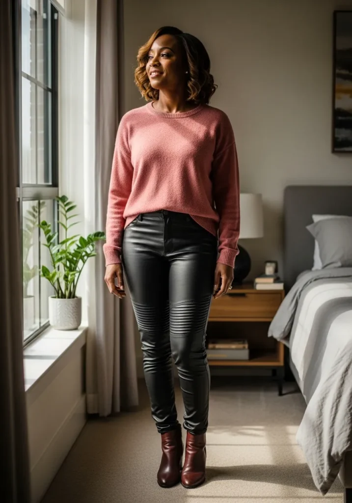 This outfit features a soft pink knit sweater styled with sleek black leather pants and ankle boots. The cozy texture of the sweater balances perfectly with the glossy finish of the pants, creating a look that feels relaxed but bold. The soft pink adds warmth while the leather keeps the vibe confident and city ready.
