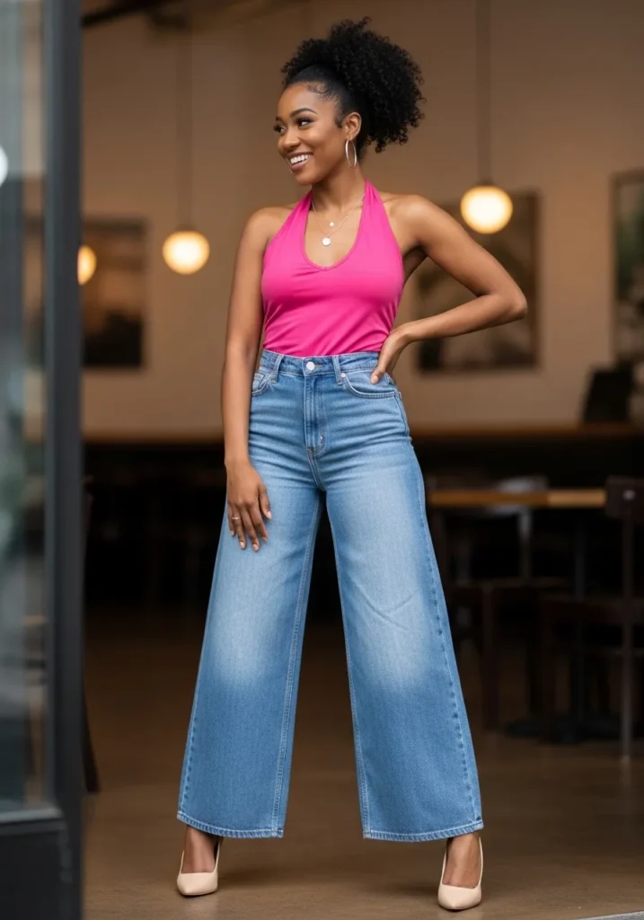 This outfit combines a fitted pink tank top with wide leg blue jeans and heels for a bold yet clean look. The simple top lets the color shine, while the denim adds structure and balance. The overall vibe feels confident, modern, and very baddie coded.