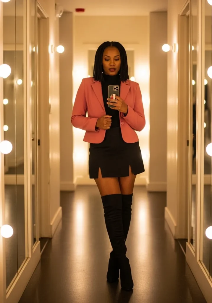 This outfit features a fitted pink blazer styled with a black mini skirt and thigh high boots for a bold night out vibe. The structured blazer adds polish, while the short skirt and boots bring drama and confidence. It feels sleek, fearless, and very baddie coded.