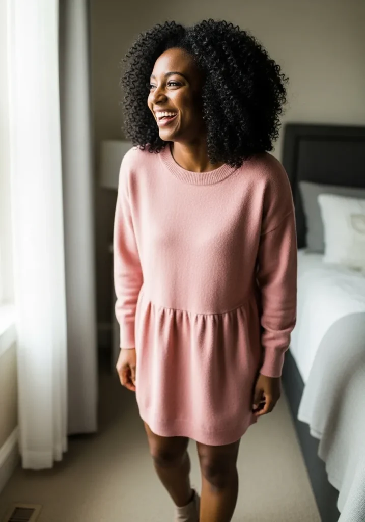 This outfit features a soft blush pink sweater dress with a relaxed fit and clean lines that feel cozy and feminine. The fabric looks lightweight but warm, perfect for an easy day look that still feels polished. Paired with minimal accessories and natural hair texture, the whole vibe feels effortless and warm.