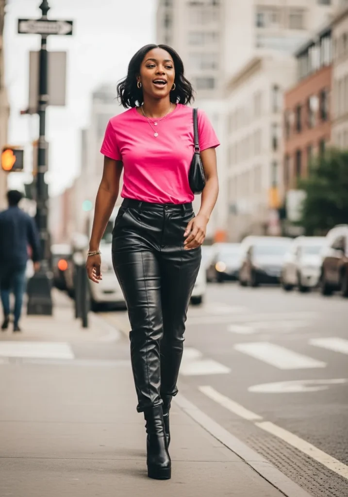 This outfit works so well because it balances bold and edgy perfectly. The leather pants give structure and attitude, while the pink top keeps it fun and fearless. I always feel powerful in a combo like this because it turns heads without feeling overdone.