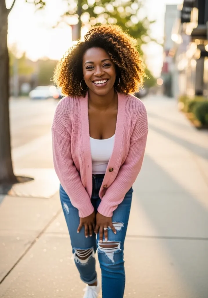 This outfit mixes a soft pink cardigan layered over a white top with ripped blue jeans and casual sneakers. The colors feel light and fresh, while the distressed denim adds a little edge. It is relaxed, cute, and perfect for everyday wear.