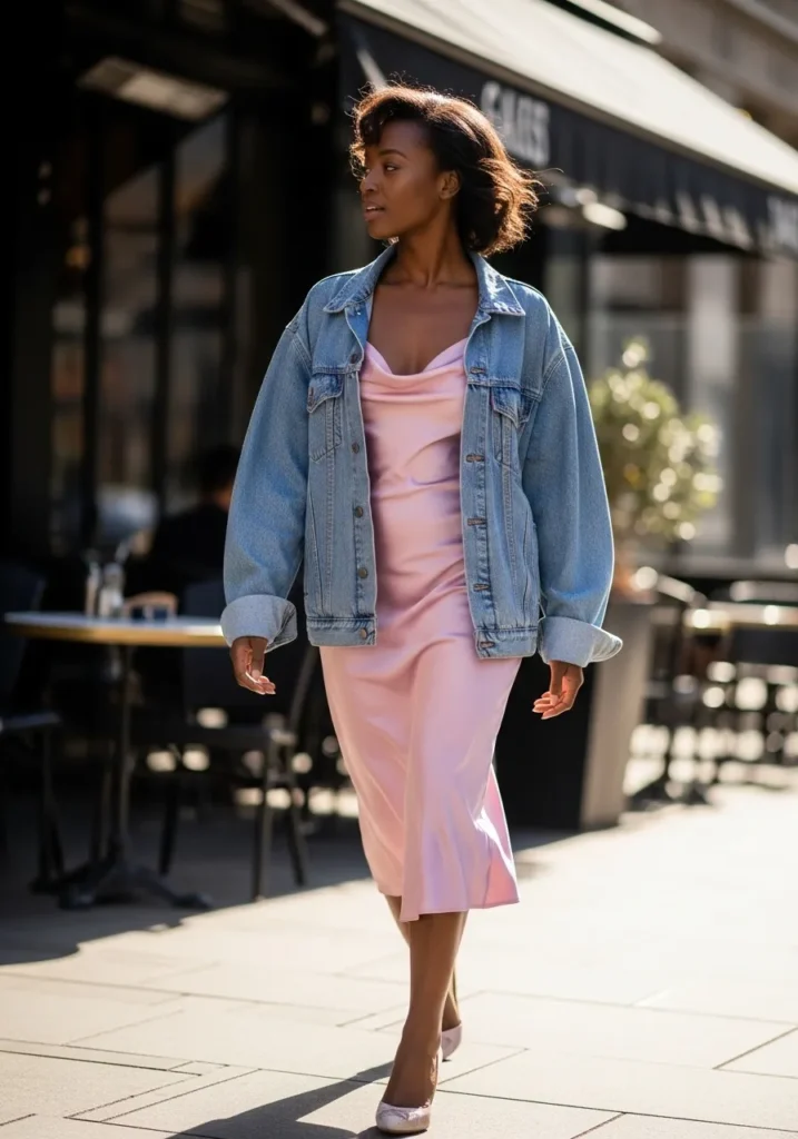 This look features a blush pink midi dress paired with a light denim jacket and neutral shoes. The soft pink dress feels feminine and flowy, while the denim jacket adds structure and a casual touch. It is a beautiful balance of sweet and street style.