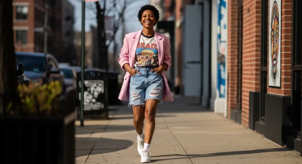 I love how this look feels powerful without trying too hard. The oversized fit gives comfort, but the shorter bottoms balance it out in the best way. This is one of those outfits I would wear when I want to feel bold, comfy, and very in control.