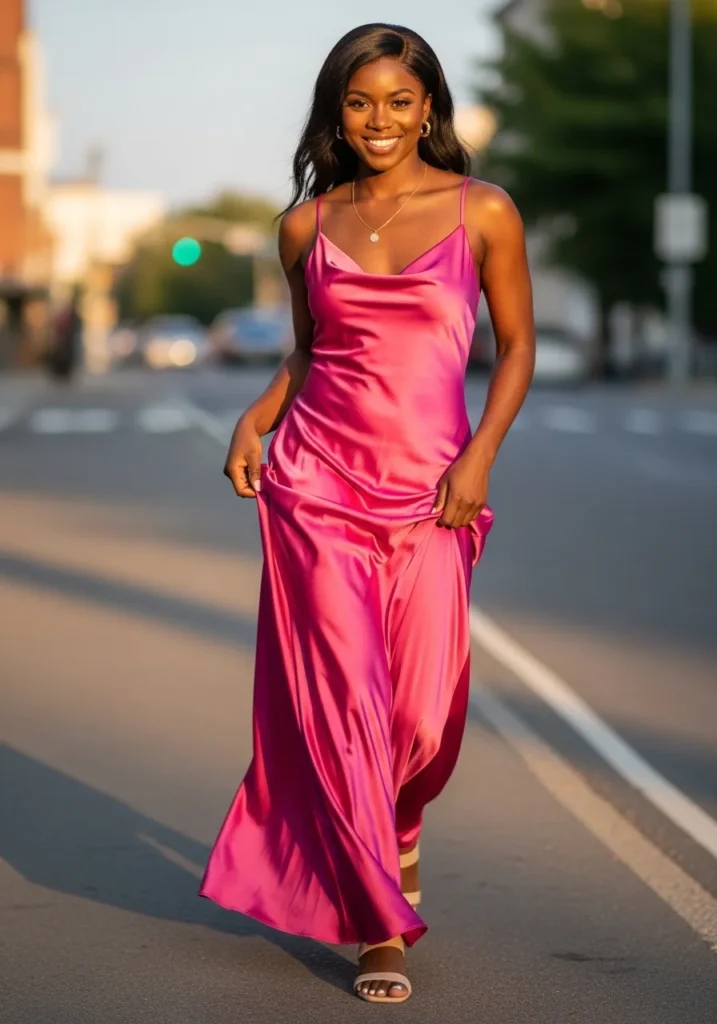 I love how powerful a satin pink dress feels when worn all on its own. It looks effortless but still turns every head. This kind of outfit always makes me feel confident and glowing.