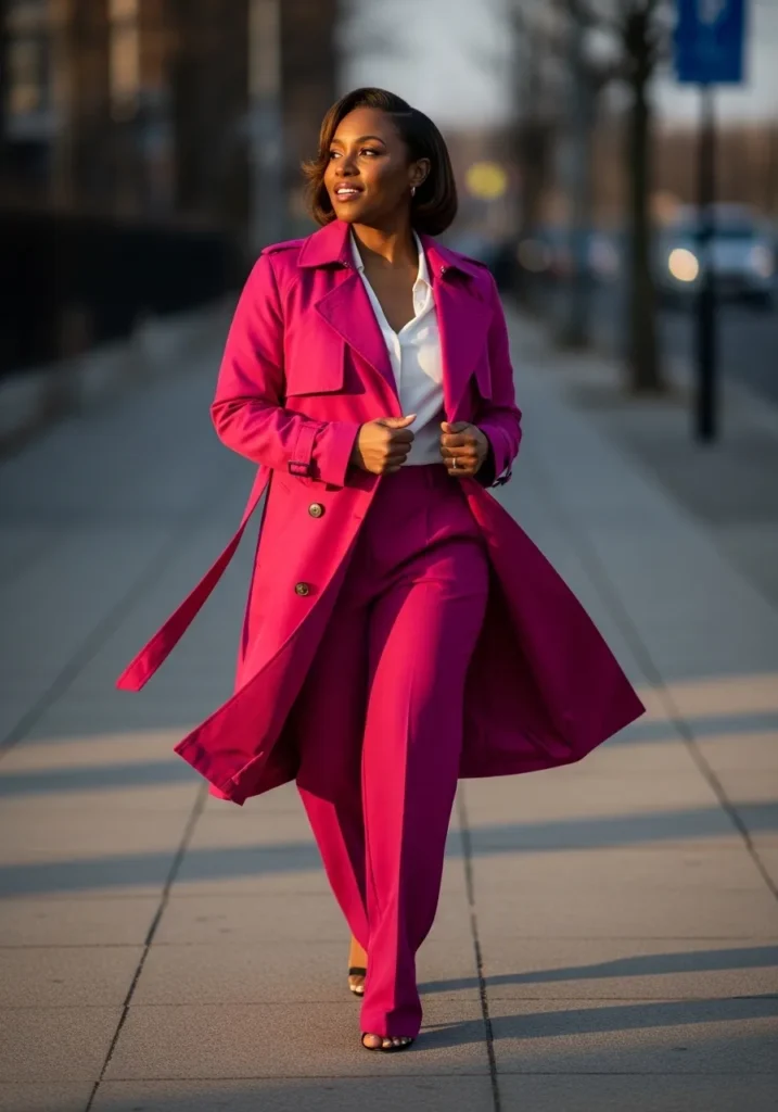This look is a bold hot pink blazer and matching tailored trousers styled with heels for a dramatic effect. The structured fabric and sharp lines make the outfit feel powerful and fashion forward. The vibrant pink shade demands attention instantly.