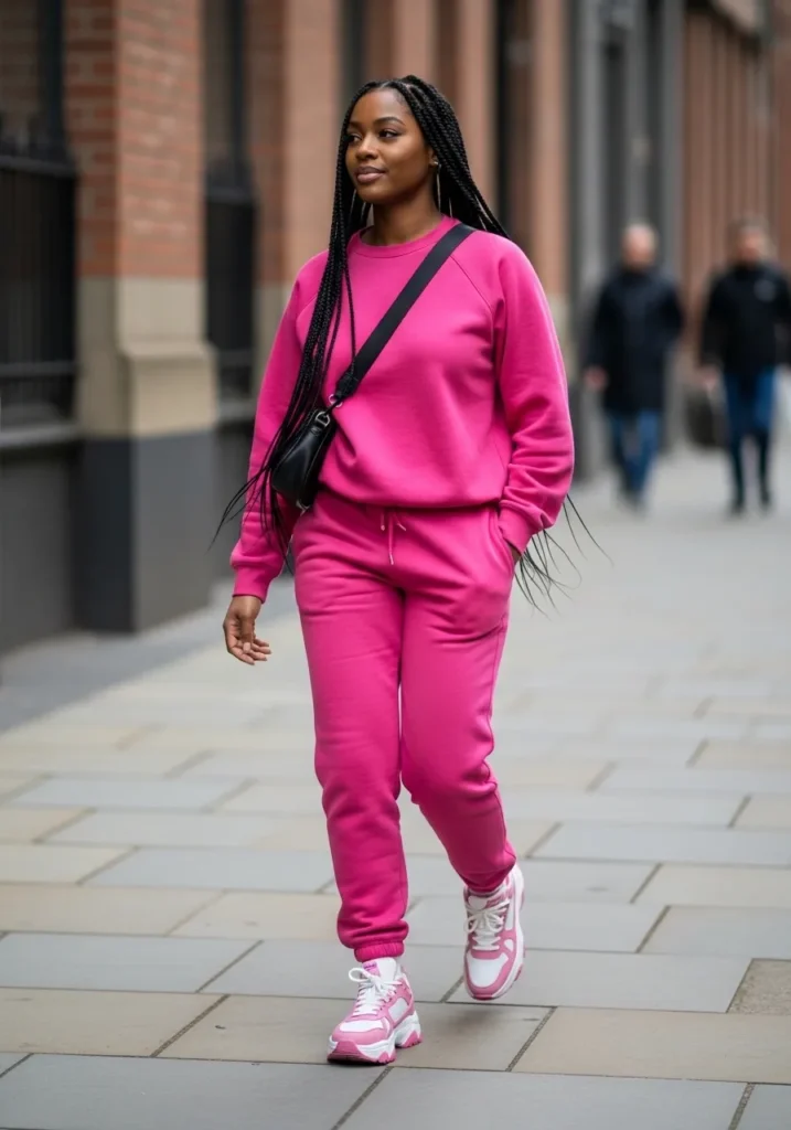 I love full pink tracksuits because they feel fun and fearless. The matching tones make it look intentional and stylish. It is the kind of outfit that feels confident without trying too hard.