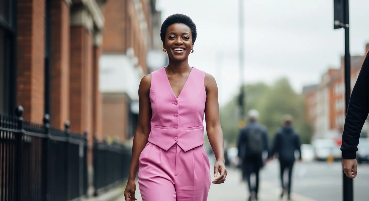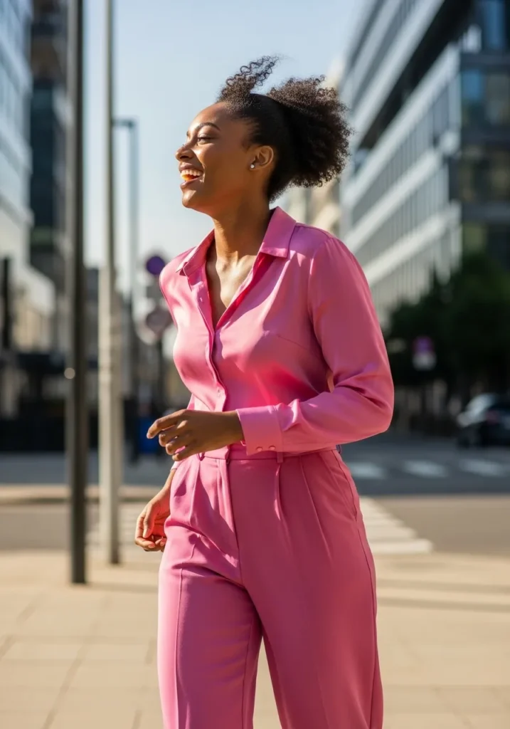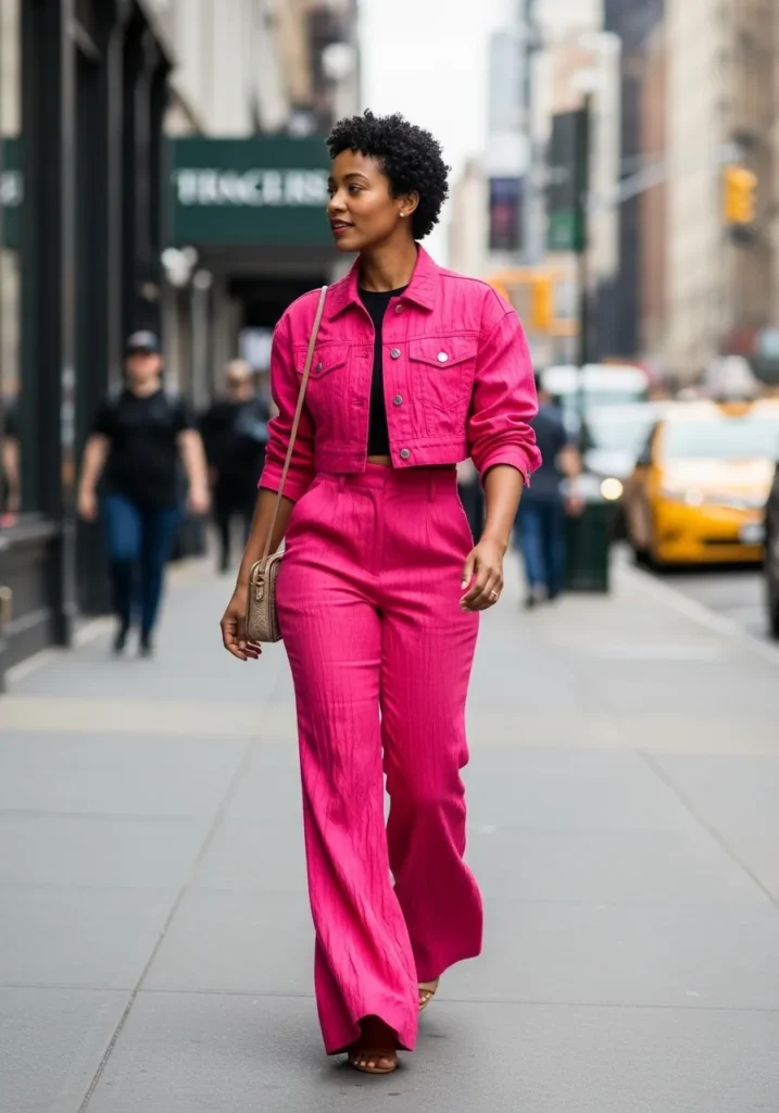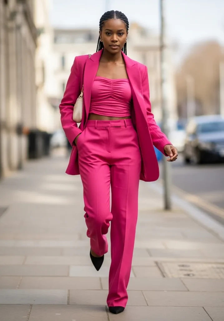 I love a full pink suit like this because it feels fearless and modern. The matching pieces make it look put together without feeling stiff. It is the kind of outfit that instantly commands attention and confidence.