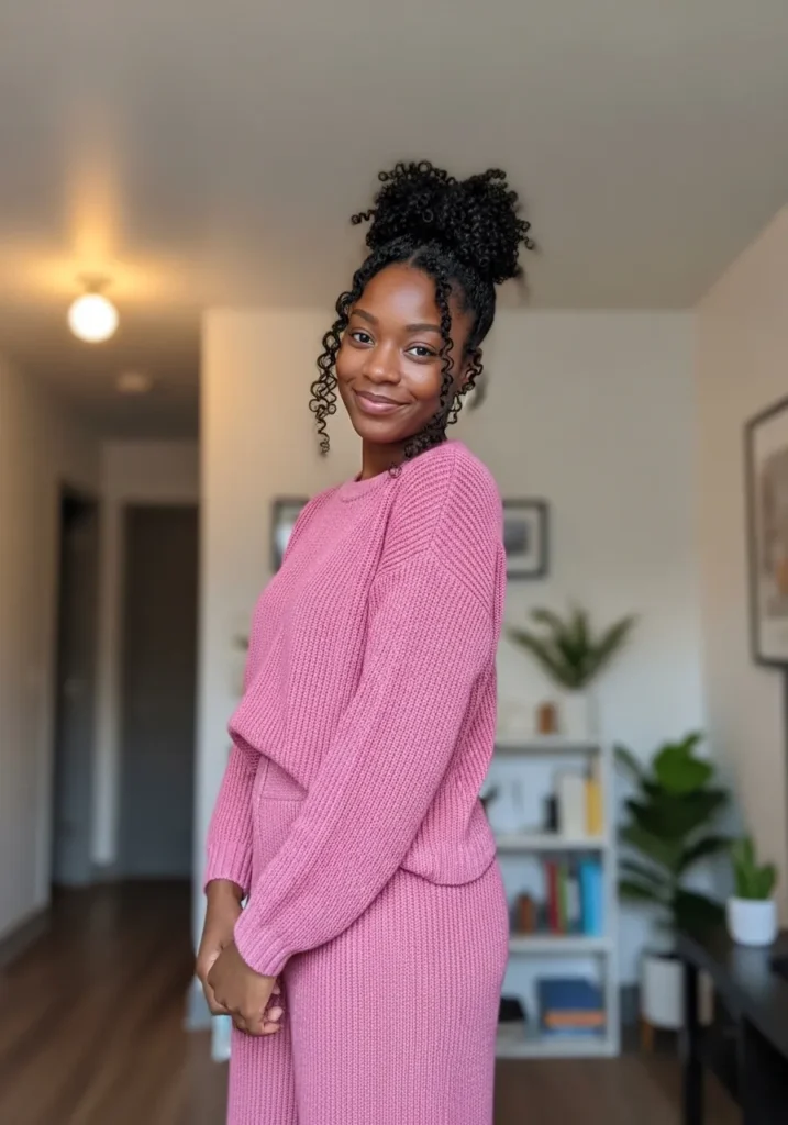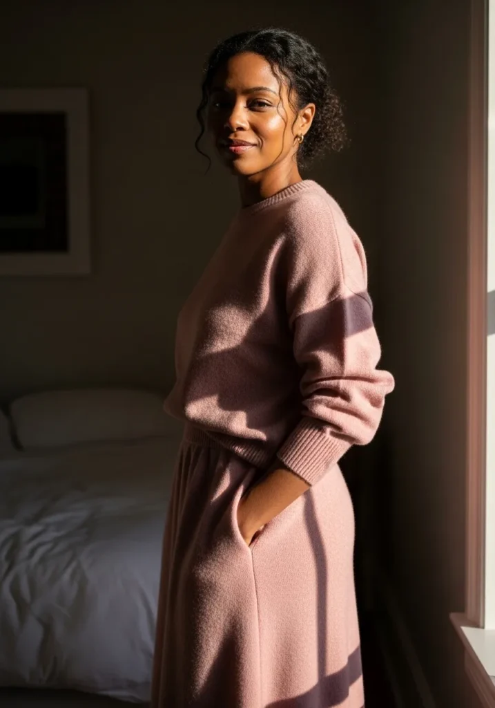 This outfit features a soft pink knit lounge set with a relaxed sweater and matching pants. The fabric looks cozy and slightly textured, giving it a comfortable but intentional feel. The full pink look feels calm, warm, and effortlessly put together.