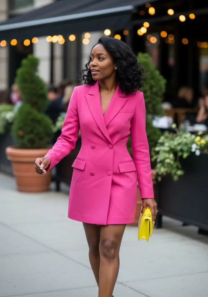 This look features a pink blazer styled as a dress with structured shoulders and clean tailoring. The bold pink color makes the silhouette pop instantly. The overall vibe feels powerful, feminine, and confident.