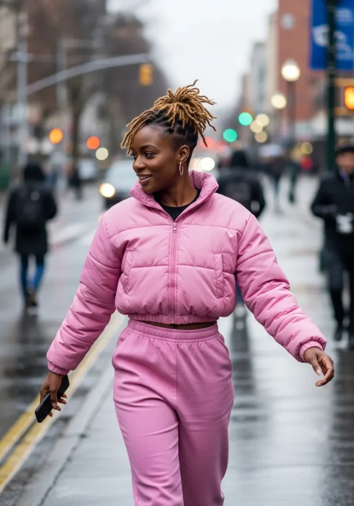 This outfit features a full pink puffer jacket styled with matching pink joggers and sneakers. The quilted texture adds volume while the monochrome color keeps it bold and cohesive. The overall vibe feels sporty confident and very eye catching.