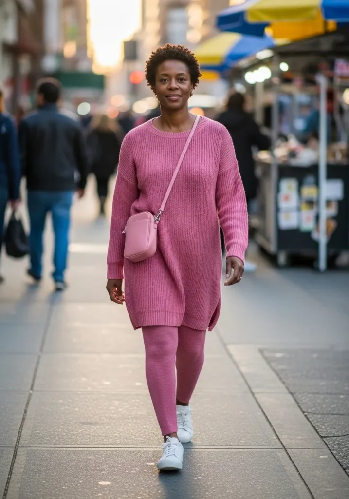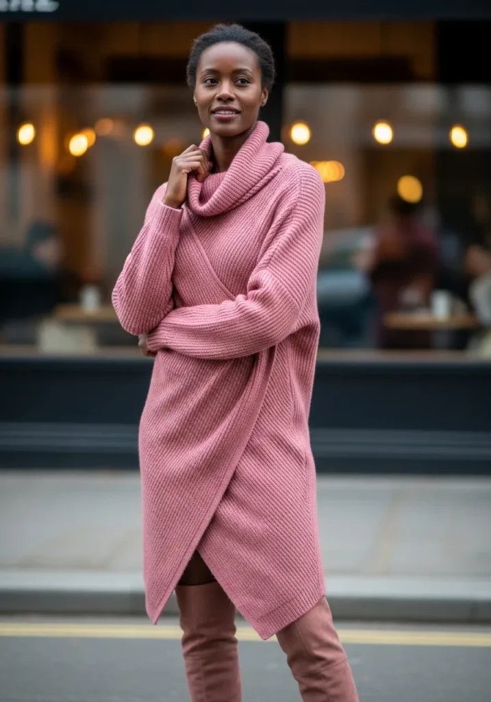 This look features a cozy pink knit dress with long sleeves and a relaxed fit. The texture of the fabric adds warmth while the solid pink color keeps it striking. It feels comfortable but still very stylish.