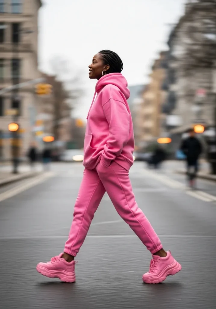 This look is a matching pink hoodie and jogger set styled with pink sneakers for a full monochrome moment. The fabric looks soft and comfortable while the relaxed fit gives it a cool street vibe. Everything about this outfit feels bold but wearable.
