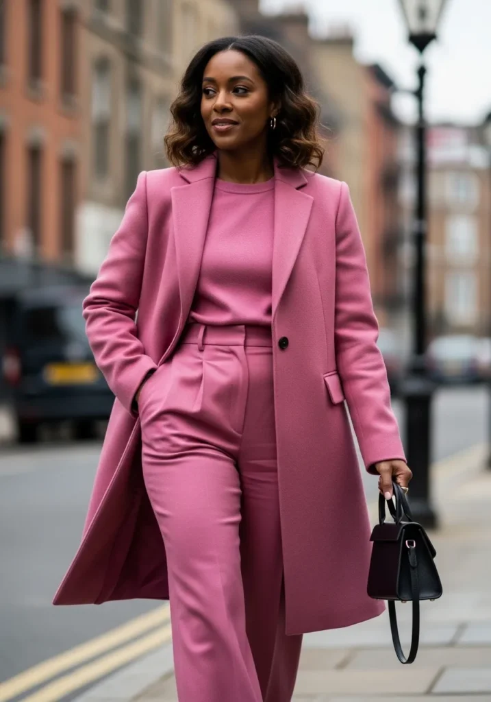 I love pink suits because they feel confident and elegant. Wearing pink from head to toe makes the outfit feel intentional and strong. It is one of my favorite ways to stand out.