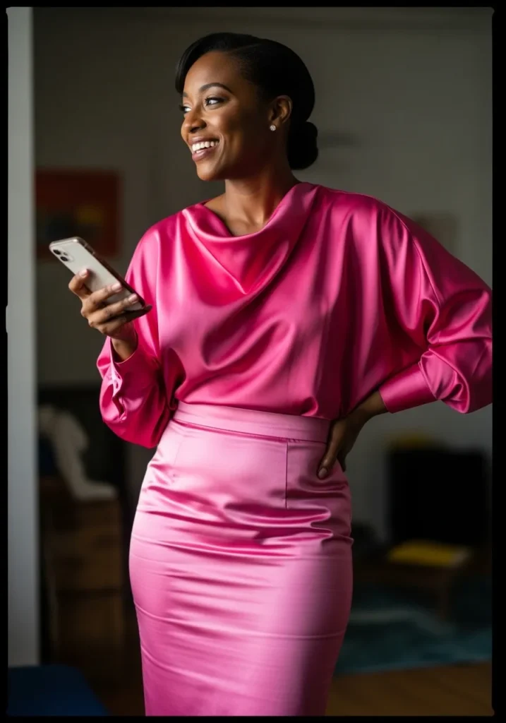 This outfit features a shiny satin pink skirt paired with a matching pink top for a glossy monochrome look. The fabric catches the light beautifully and adds movement. The silhouette feels elegant but bold.