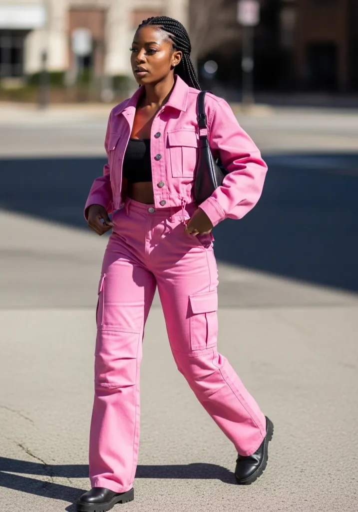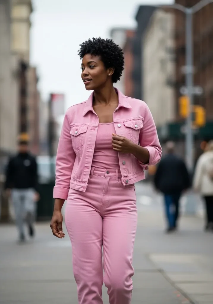 I love full denim sets because they always look intentional. The pink makes it fresh and fearless. It feels like a look people remember.