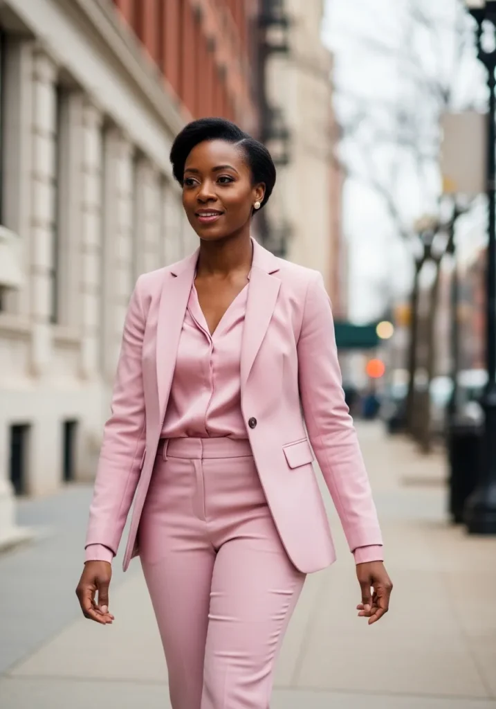 This look features a tailored pink blazer and matching pink trousers styled with a soft pink top. The clean lines and fitted silhouette give it a polished and powerful feel. The monochrome pink makes it unforgettable.