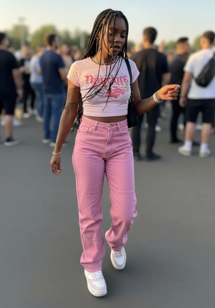 This look pairs a pink graphic tee with high waist pink pants and comfortable sneakers. The fit feels relaxed but flattering, with enough room to move freely. The overall vibe is casual cool with a playful concert feel.