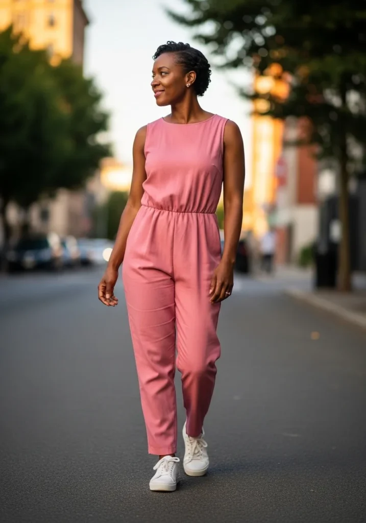 This outfit features a sleeveless pink jumpsuit with a cinched waist and straight leg fit. The fabric looks lightweight and stretchy, making it easy to move through crowds. Sneakers add comfort and balance to the look.