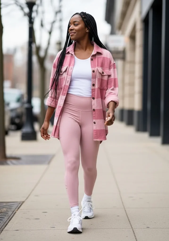 This look features a pink denim jacket layered over a matching pink top and leggings. The denim adds structure while the softer pieces keep it comfortable. Sneakers complete the look with ease.