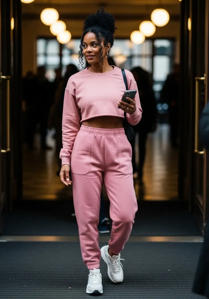 This look features a relaxed pink lounge set with a soft top and matching pants. The fabric looks cozy and stretchy, perfect for moving through the crowd. The monochrome pink keeps the look stylish even in low light.