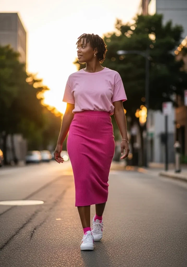This look pairs a soft pink tee with a stretchy pink midi skirt and sneakers. The skirt has enough give to move easily while still feeling feminine. The overall vibe feels relaxed and stylish.