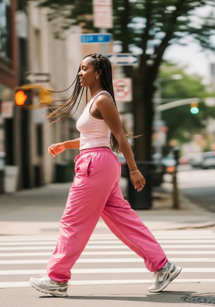 This outfit features pink cargo pants styled with a fitted pink tank and sneakers. The pants feel roomy and flexible, ideal for lots of movement. The tank keeps things light and breathable.